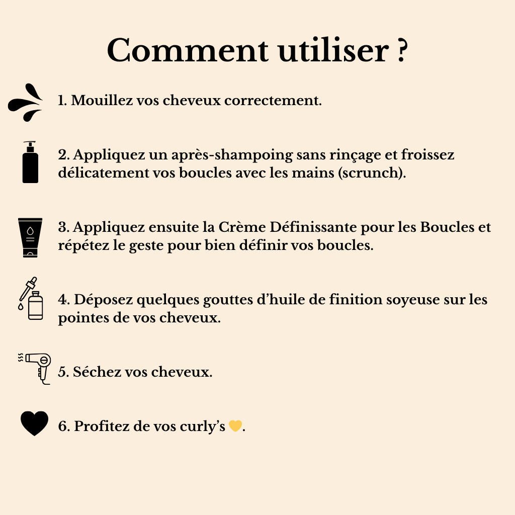 Après ton shampoing ou ta routine soin, applique une petite quantité sur cheveux humides ou essorés.